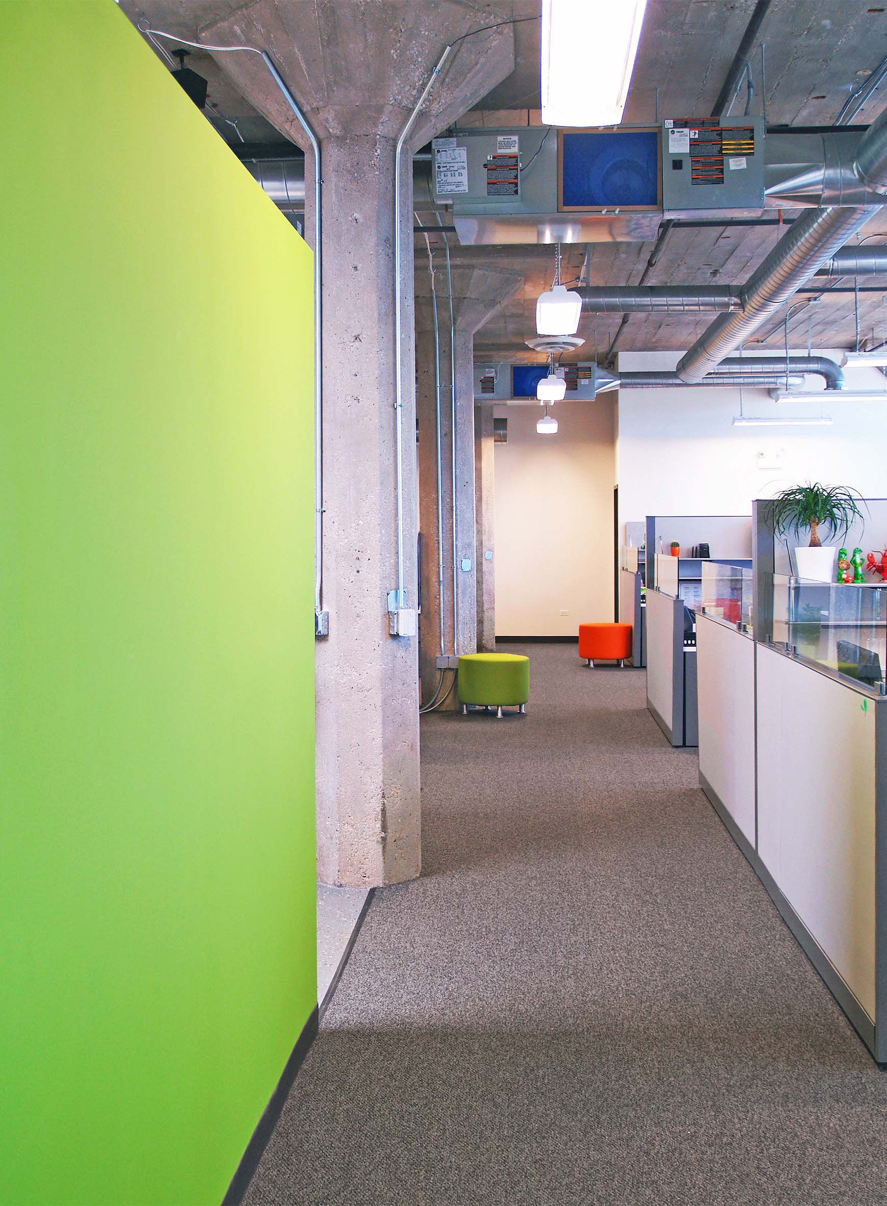 The program included four perimeter offices, conference room, open workstations to accommodate 22 employees, an open lounge/reception area, kitchen, and computer room.